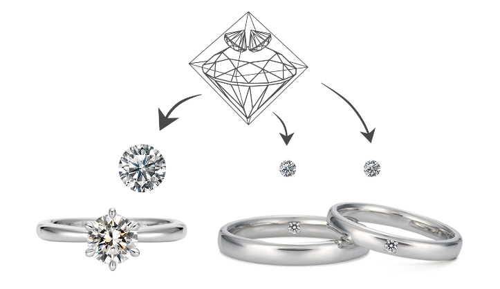 大型切割鑽石可鑲嵌於訂婚鑽戒,小型鑽石則點綴於結婚對戒上,