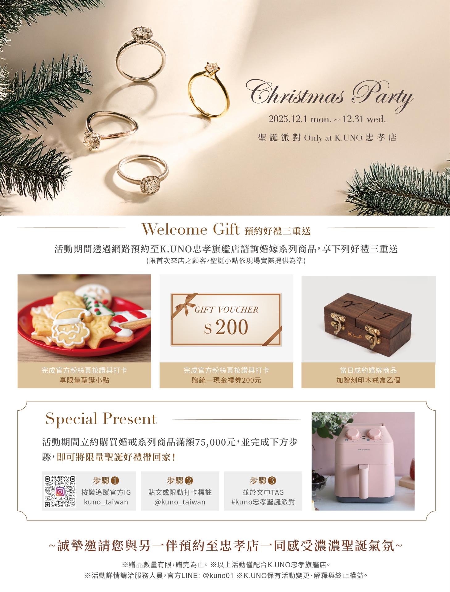 K.UNO忠孝旗艦店限定✧Christmas Party活動2025.12.1活動詳情歡迎來店洽詢店鋪人員~■ 預約來店諮詢:https://www.k-uno.com.tw/reservation■ 忠孝店官方LINE:https://lin.ee/utJwk8c2025.12.1活動K.UNO台南店限定...PREV最新消息一覽2025.12.1重要公告K.UNO冬季時尚鑽...NEXT