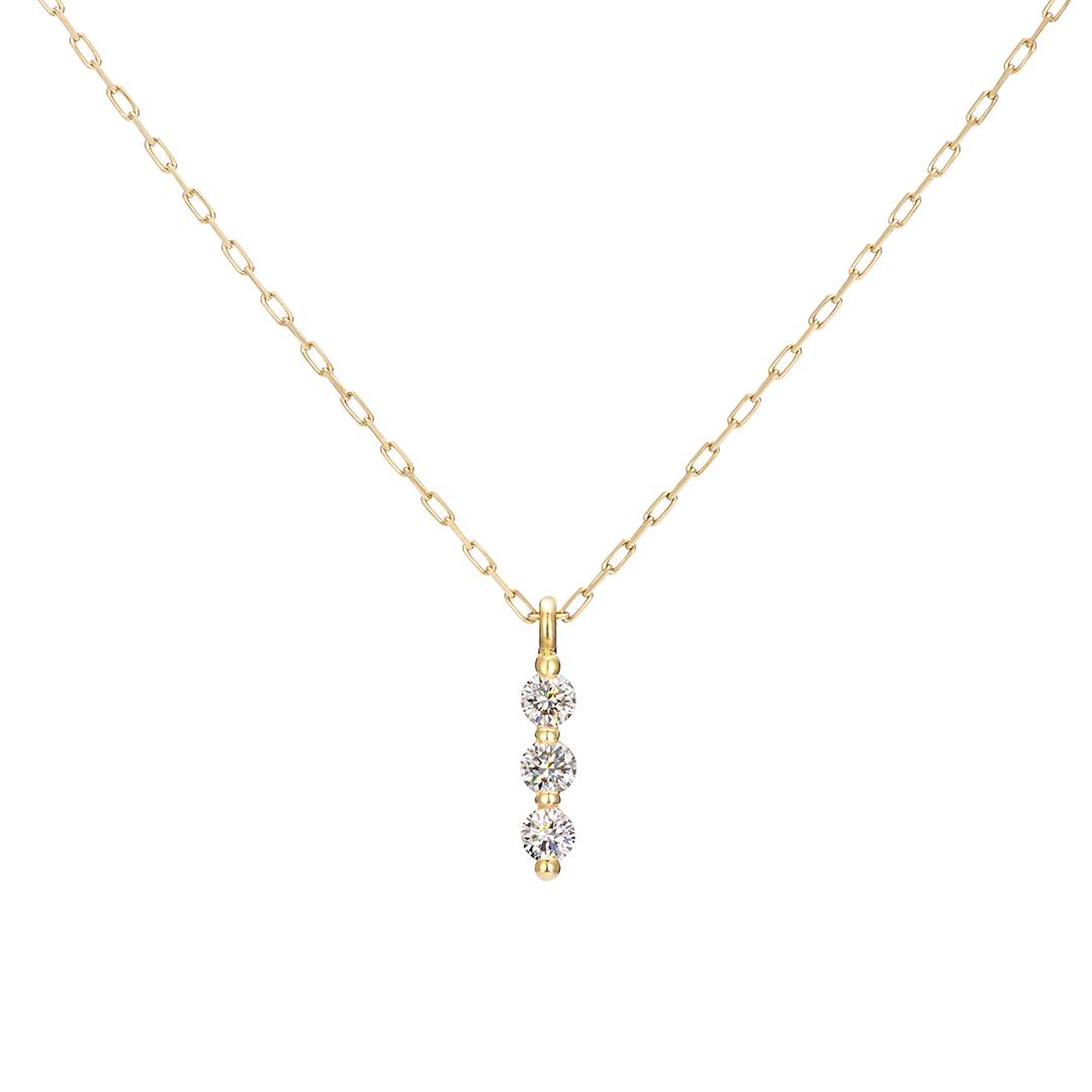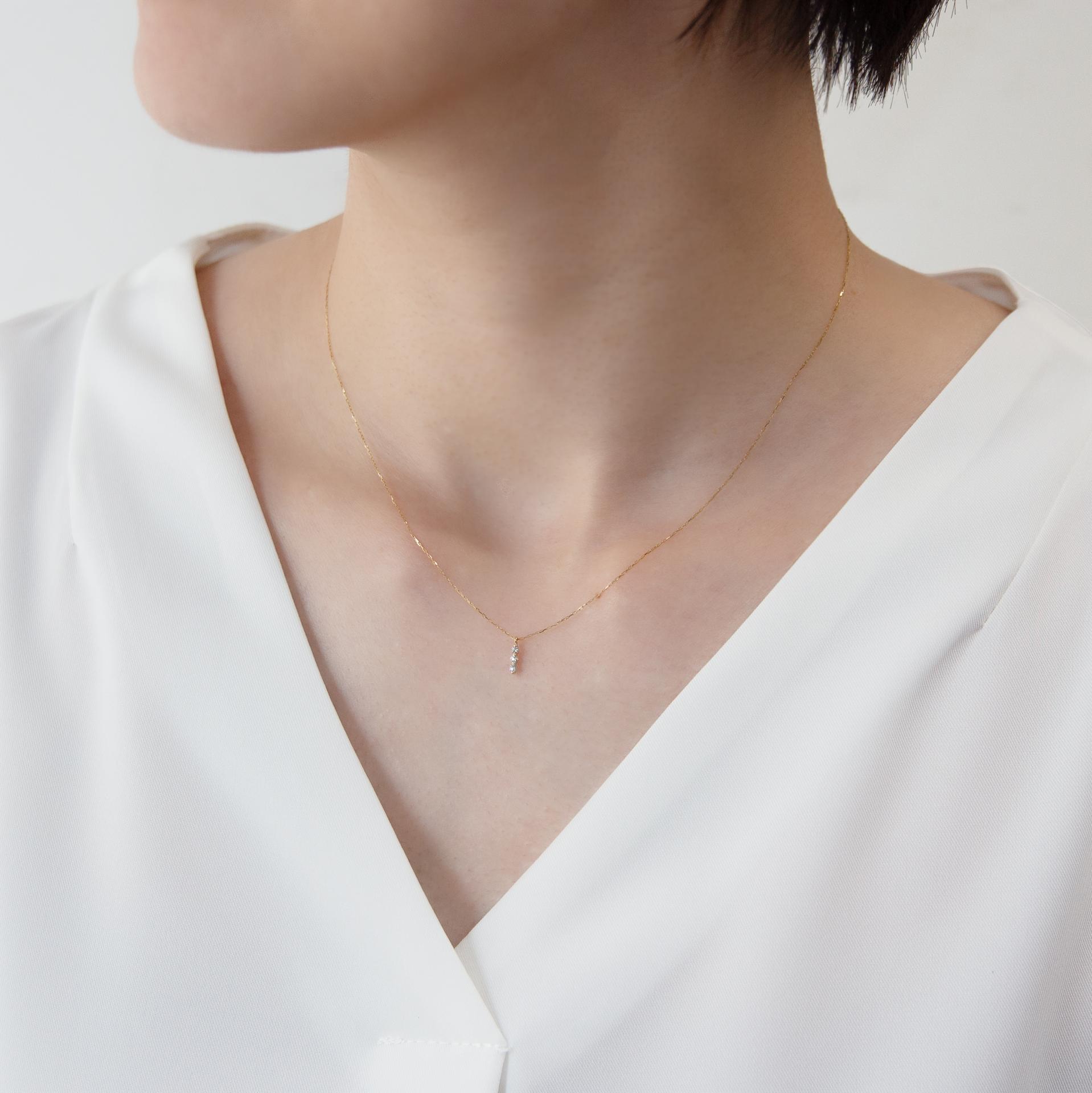 由三顆配鑽構成的項鍊,在胸前散發出細緻而低調的光芒。