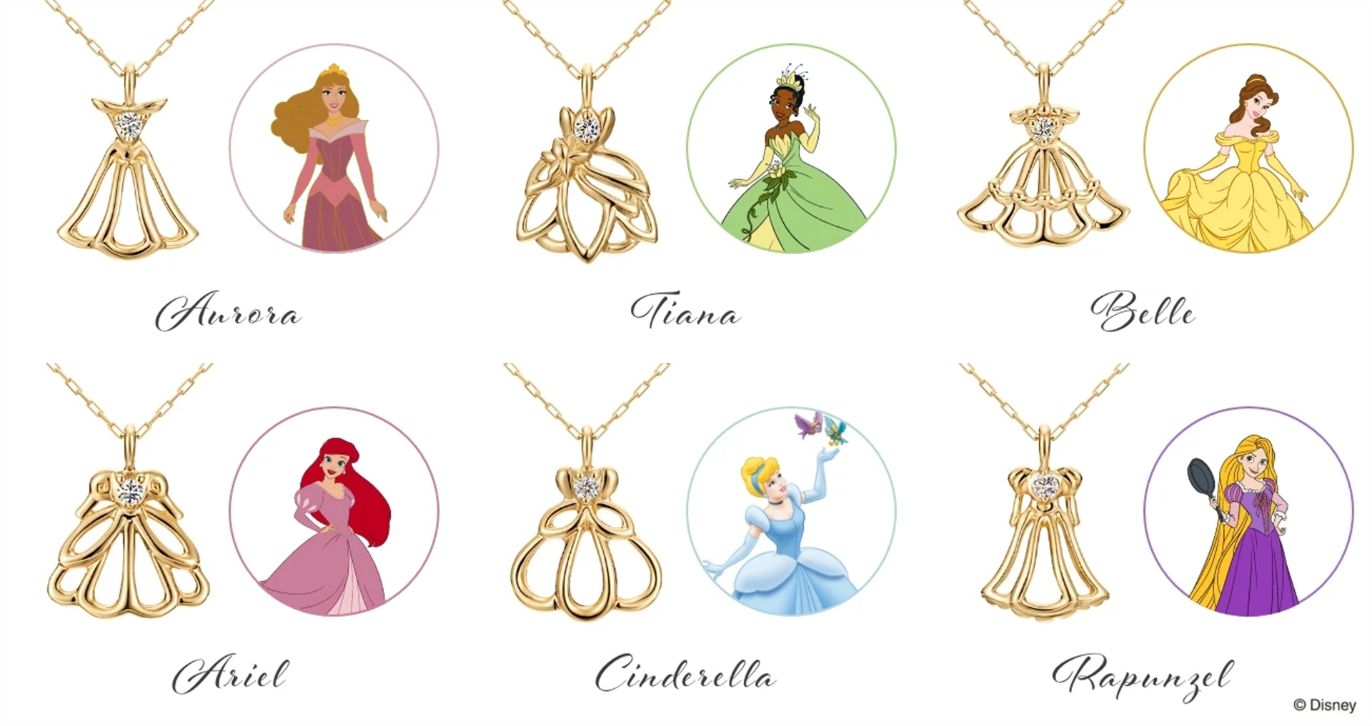 本次新作以「穿上禮服的瞬間,世界被光芒包圍」為靈感,打造出以迪士尼公主禮服為主題的項鍊系列。
